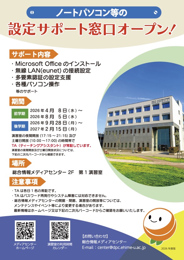 総合情報メディアセンターでは本学生が自由にパソコンが利用できるように,夜間開放・土曜日開放を行っています。その間TA(ティーチングアシスタント)が常駐し,ノートパソコンやスマホのWi-Fi(eunet)等のサポートを行っていますので,ご利用ください。