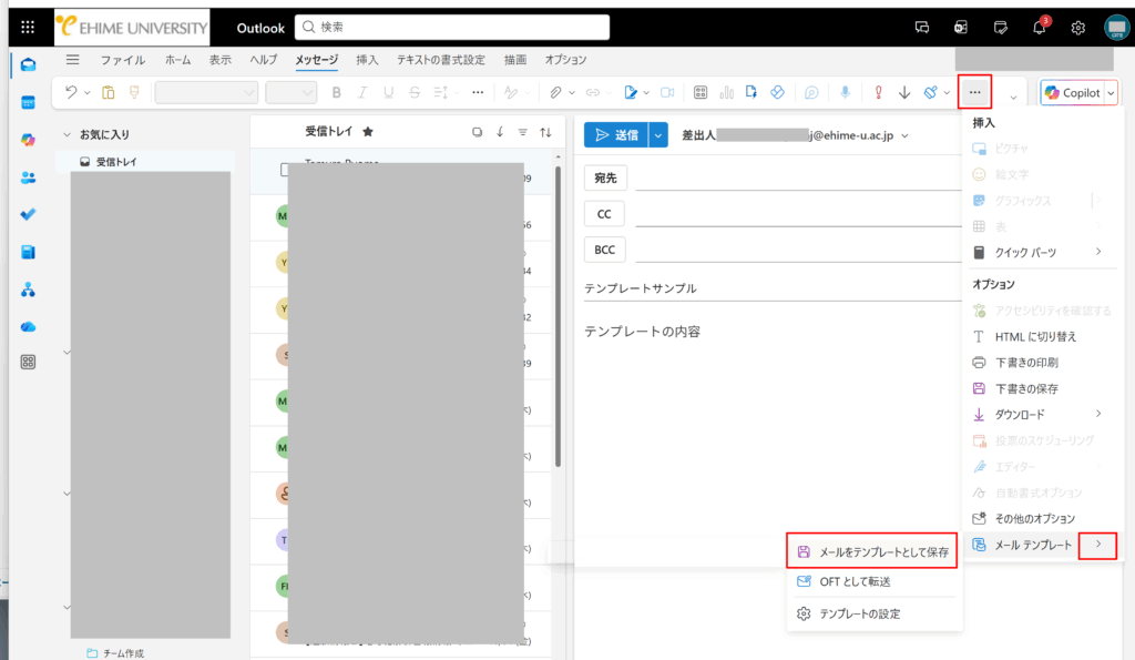 「・・・」をクリックして「メールのテンプレート」から「メールをテンプレートとして保存」を選択します。
