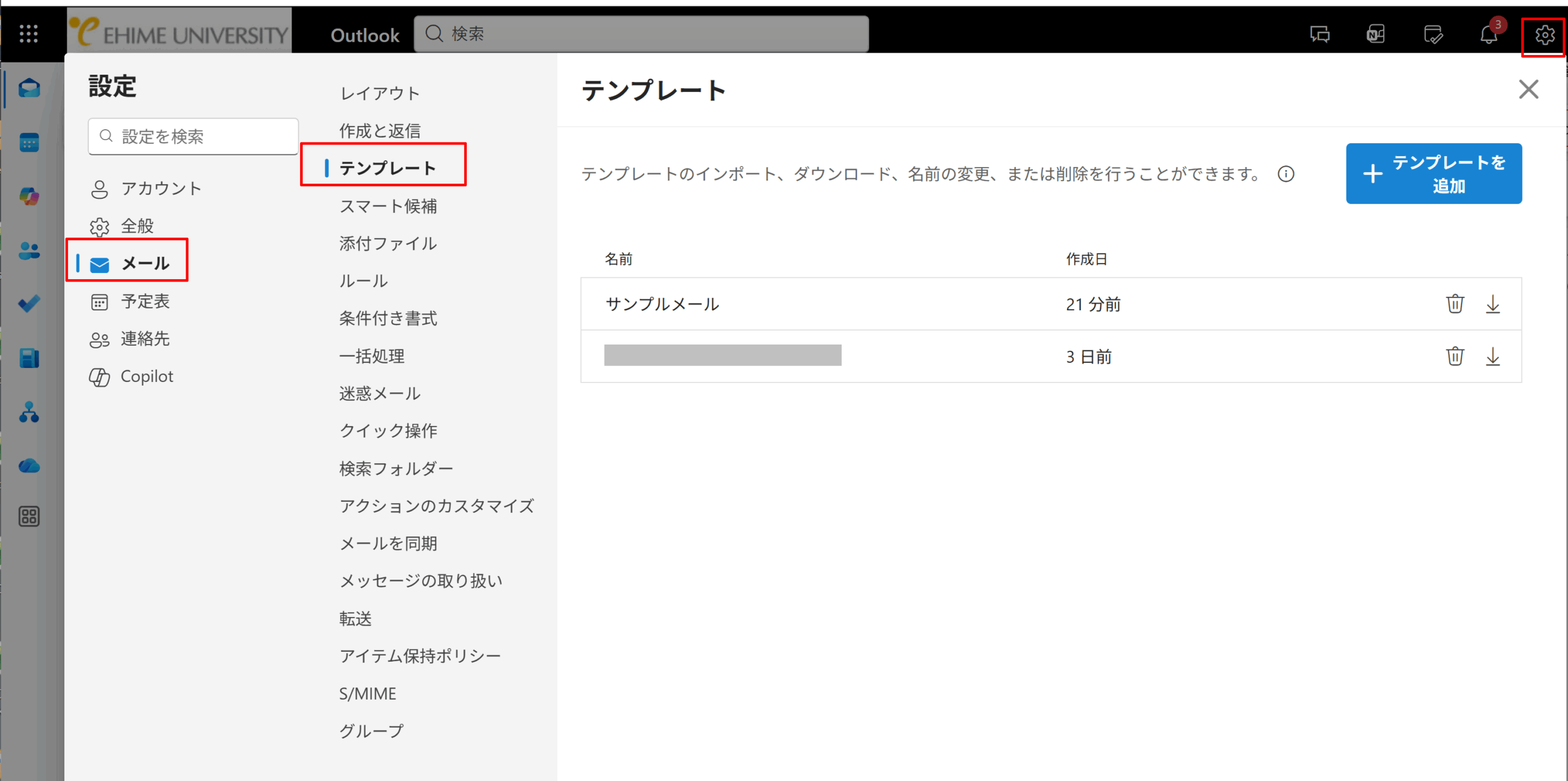 2.「メール」 ー 「テンプレート」の順にクリックしてください。